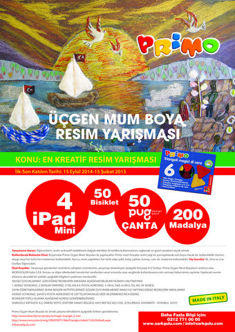 Primo Üçgen Mum BoyaÇocuk Resim Yarışması kapsamında, çocukların yaratıcılıklarını ön plana çıkarması hedefleniyor.Çocuk resim yarışmaları arasında, farklıtekniğe sahip olan Primo Üçgen Mum Boya Resim Yarışması için son başvuru tarihi Şubat ayı olarak açıklandı. Çocuklar, yarışmaya katılacak eserlerinde mum boya kullanacakları gibi; farklı materyal ve teknikler de kullanabilecek.